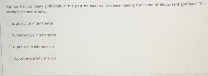 Which of the following statements best describes proactive interference. Log in for more information. So proactively interfering is the difficulty of learning new things about the subjects one has previously learned.